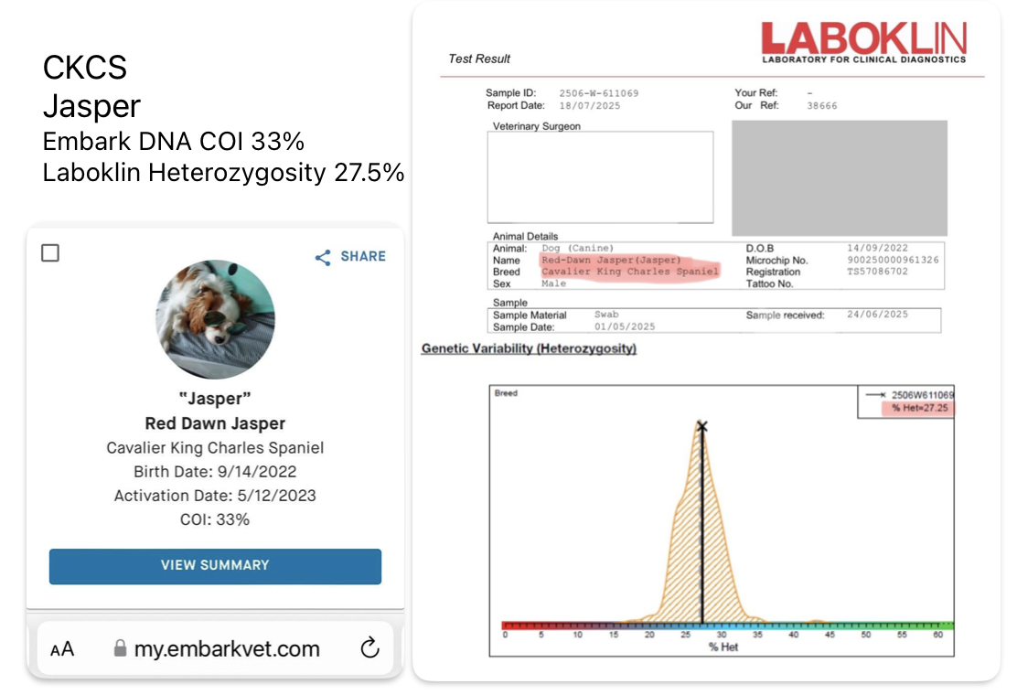 Jasper has his DNA tested at two companies. Embark looks at runs of homozygosity, meaning how similar were the parents to each other. The result is called COI and the higher the score the more inbred the dog. Laboklin looks at Heterozygosity, meaning how similar is Jasper to the other Cavalier King Charles Spaniels tested by Laboklin. At the time of this test 300 CKCS were profiled and compared at Laboklin. In Heterozygosity the lower the score the more genetically diverse the dog is compared to his breed.