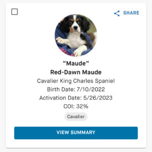 Maude is from American lines who are mostly not show dogs. These types of lines are called “pet bred”. Her inbreeding is 32%, the same as many Cavaliers.