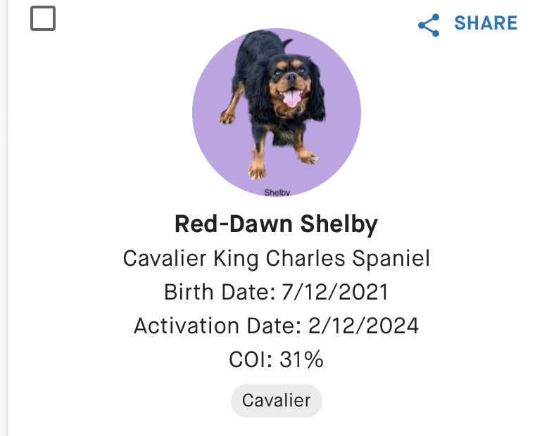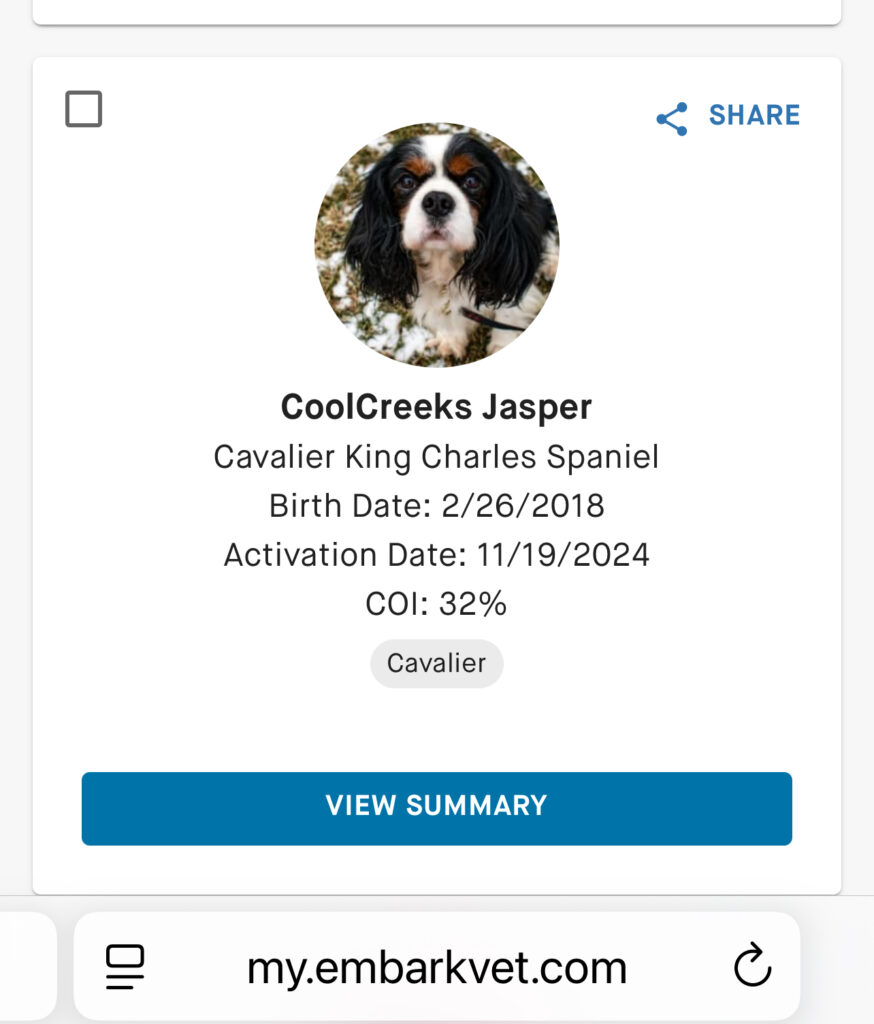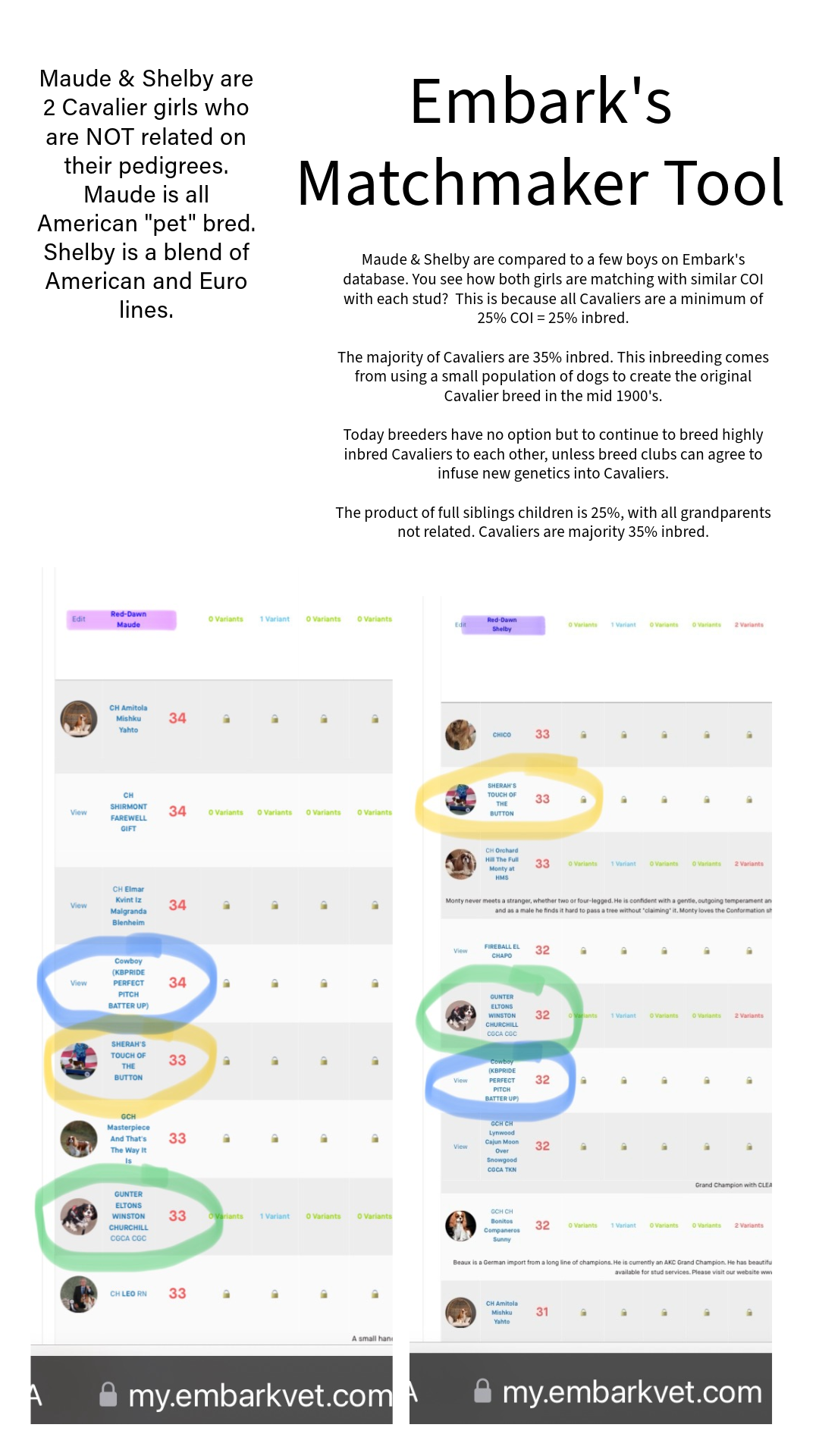 Embark’s Matchmaker Tool can suggest low or high COI pairing for a breeding dog. This is a valuable tool to know if a potential match is a good pairing choice. Gone are the days of looking at a written pedigree to decide if the potential parents are too closely related. DNA now tells us actual inbreeding of our dogs and their potential offspring. In this visual example Jasper is paired with multiple girls. The settings were for the lowest and highest inbreeding of options of thousands of Cavaliers profiled by Embark.