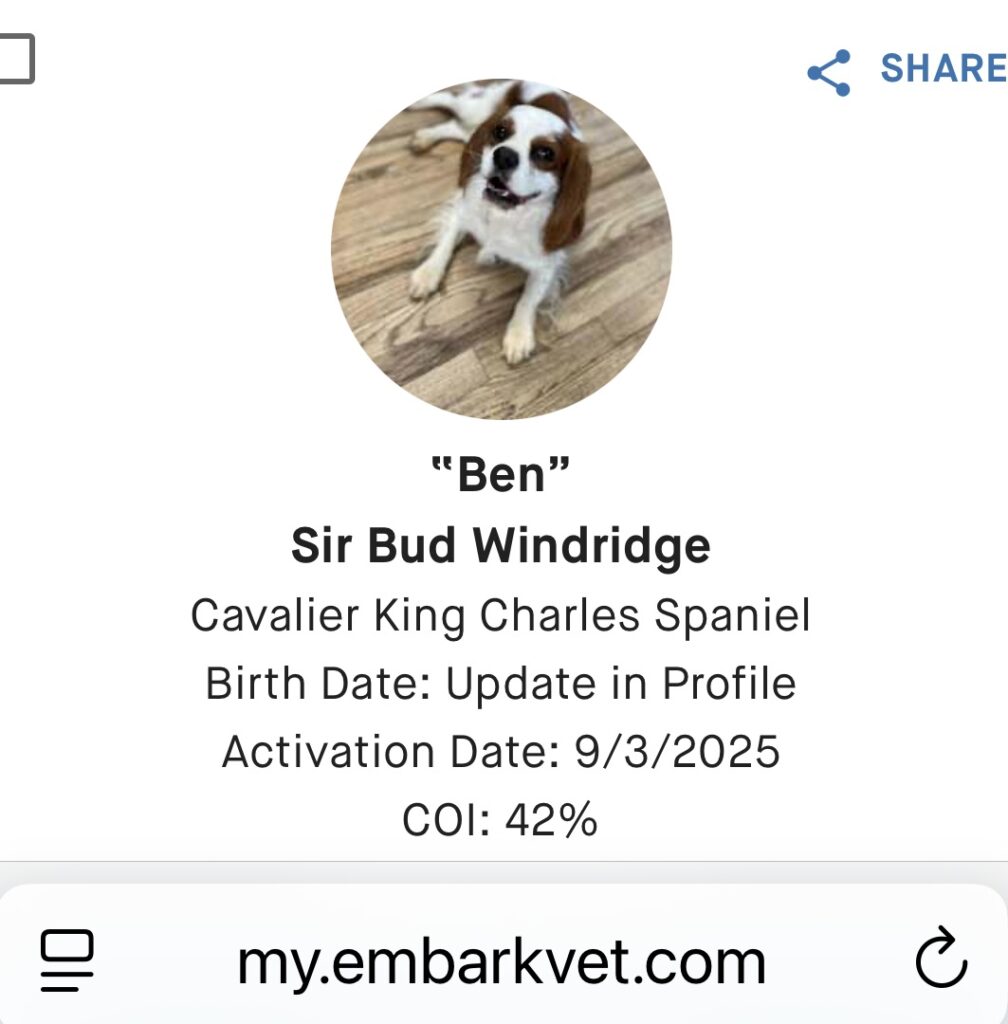 Ben is from American lines of CKCS. Embark DNA COI is 42%. Pedigree COI for 12 generations is 3.9%.