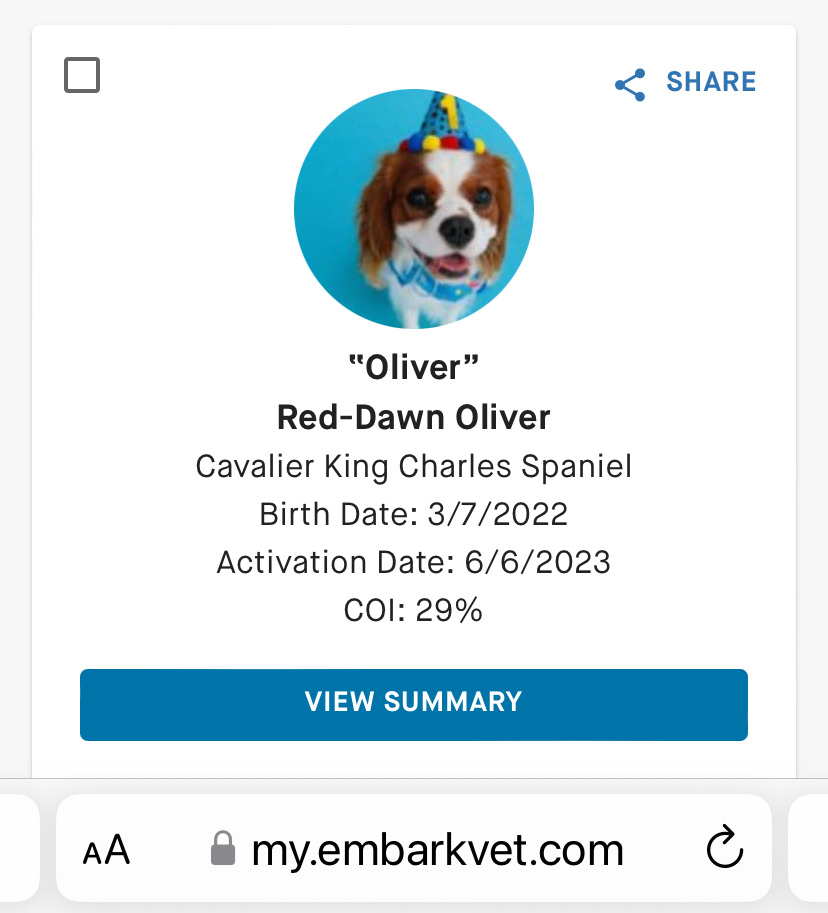 Today we can DNA test a dog and know his inbreeding percentage. This technology has revolutionized understanding of dogs.  Also, two dogs can be analyzed together to know the offspring’s potential inbreeding. This new science is easily utilized with Embark Genetics Genome-wide COI. Simply DNA test your dog at Embark to know your dog’s COI.  Then later use their MatchMaker Tool and Pair Predictor tool to see what inbreeding the potential matches offer for offspring. Inbreeding calculation is called COI, Coefficient Of Inbreeding. All Cavaliers DNA tested in every study, are over 25% COI with the majority at 35-40% COI